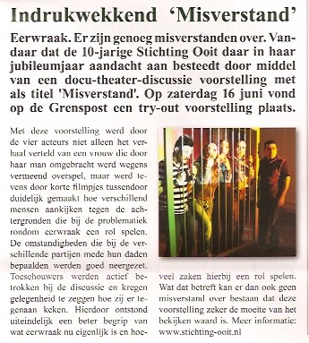 Theaterstichting OOIT uit Arnhem is in 2001 opgericht naar aanleiding van de aanslagen in de Verenigde Staten met het doel een brug te slaan tussen de verschillende culturen via kunst en discussie. “Misverstand” is een docu-theater-discussie-voorstelling over eerwraak en familiedrama.